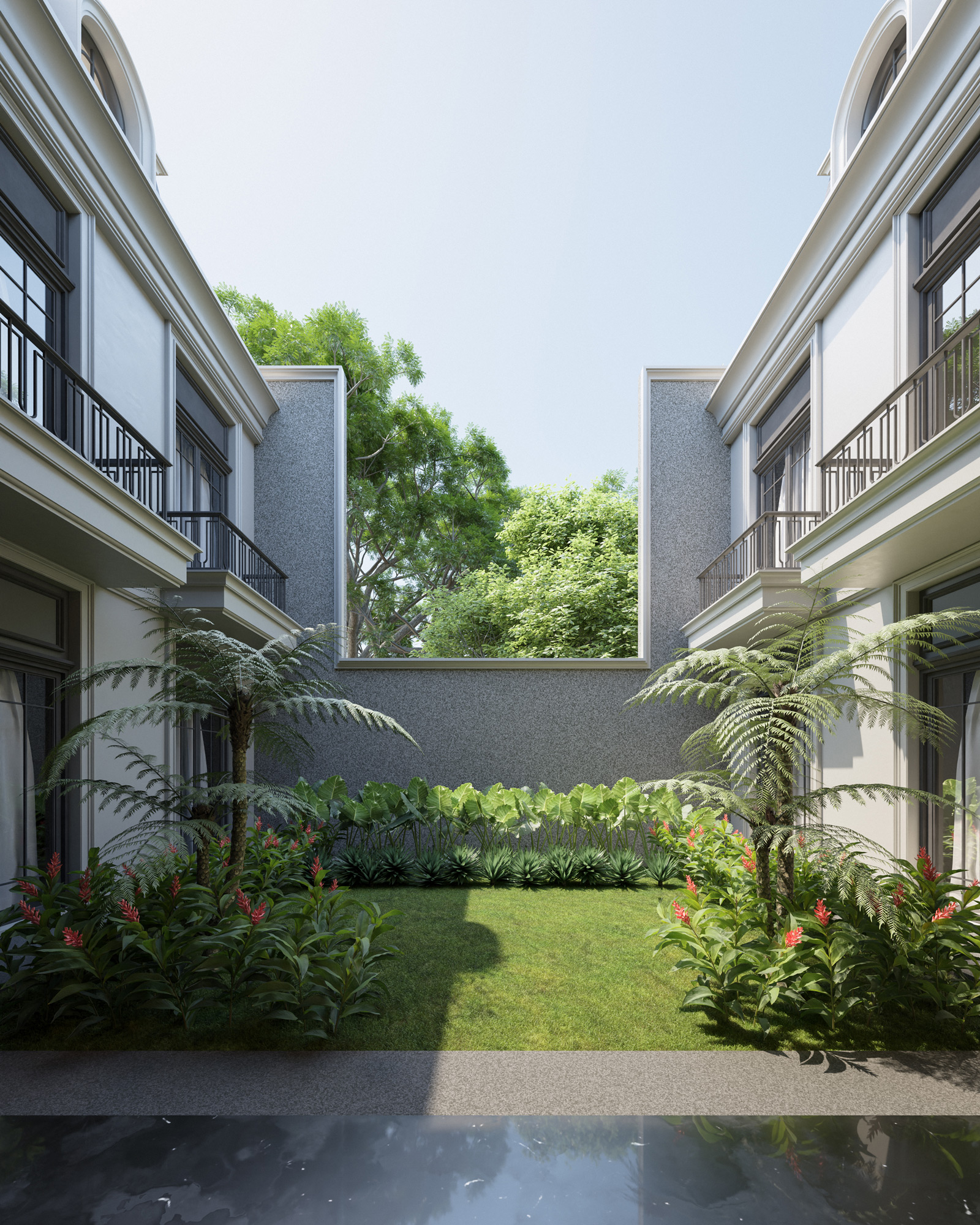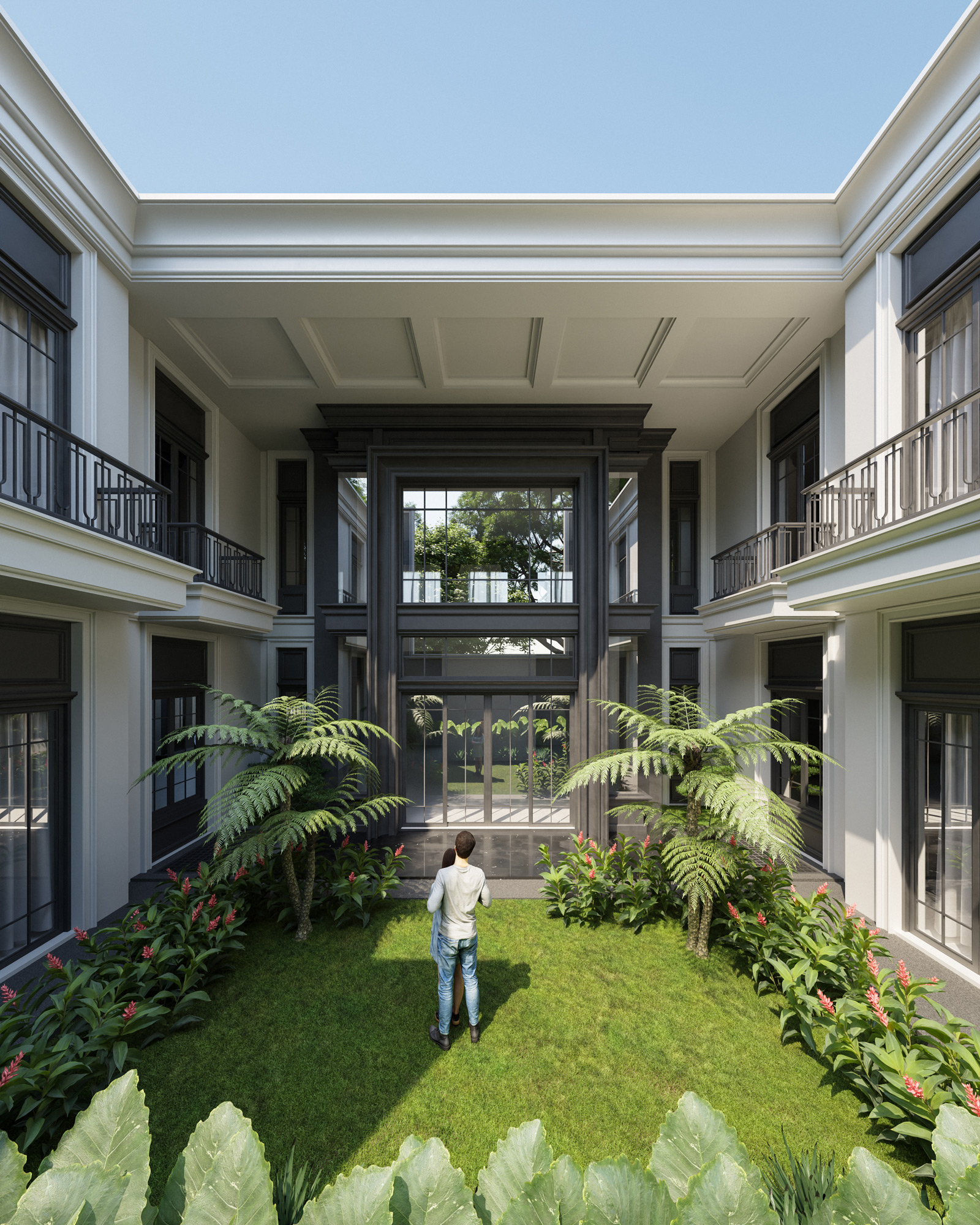 Set against the lush, tropical backdrop of Samarinda City, this project reimagines American Classic architecture for the modern era. The residence commands attention with a stately, symmetrical facade that beautifully contrasts crisp, off-white stucco with bold, charcoal-toned window frames and architectural trim.