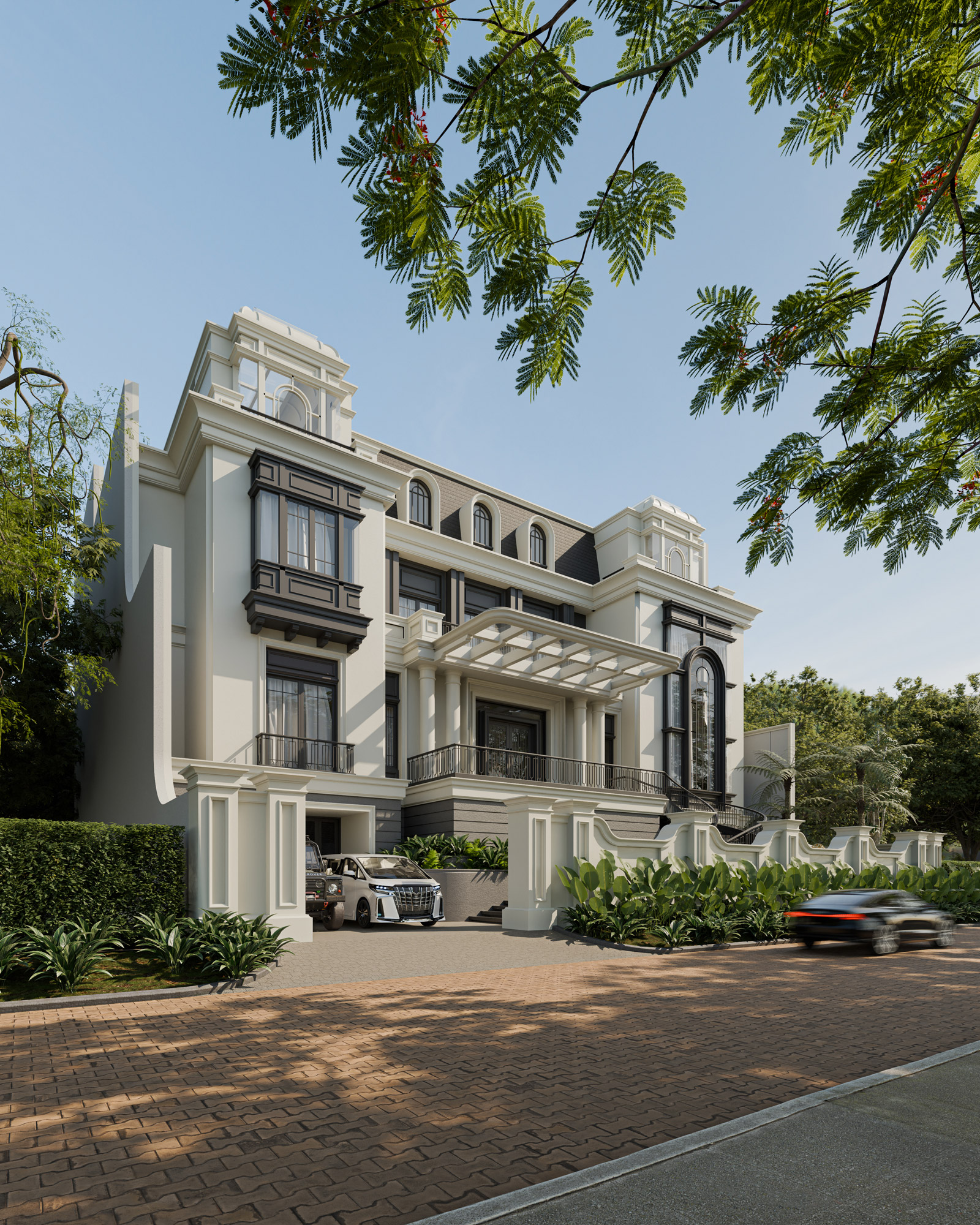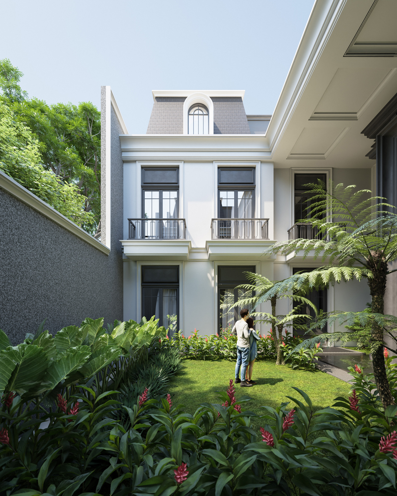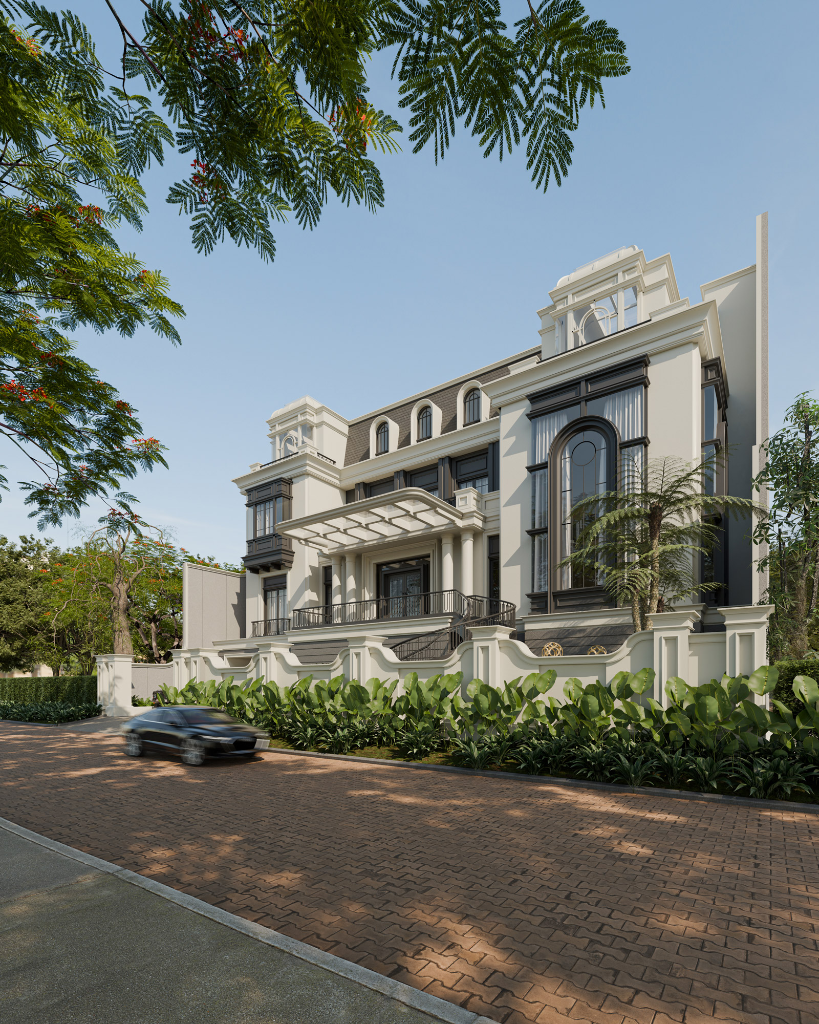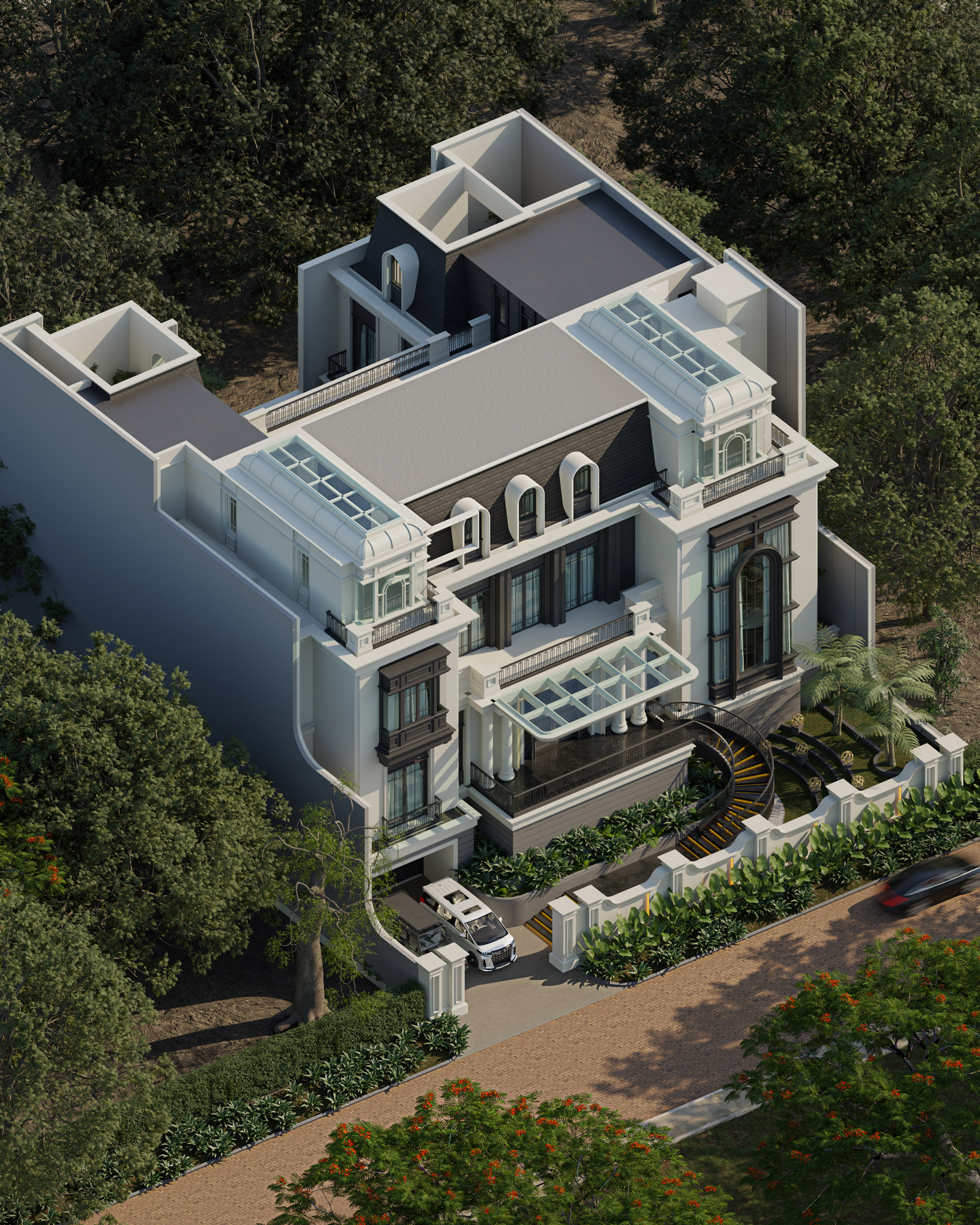 A grand central portico and a sweeping exterior spiral staircase invite residents into a space of refined luxury. Beyond the classical monumental facade, the design integrates innovative features tailored for high-end living. A distinctive mansard roof is punctuated by elegant arched dormers and expansive glass skylights, ensuring the deep floor plan is flooded with natural light. Framed by a secure, classically detailed perimeter wall and vibrant, manicured foliage, this estate stands as a majestic, private urban sanctuary that seamlessly blends historical grandeur with modern, indoor-outdoor living.