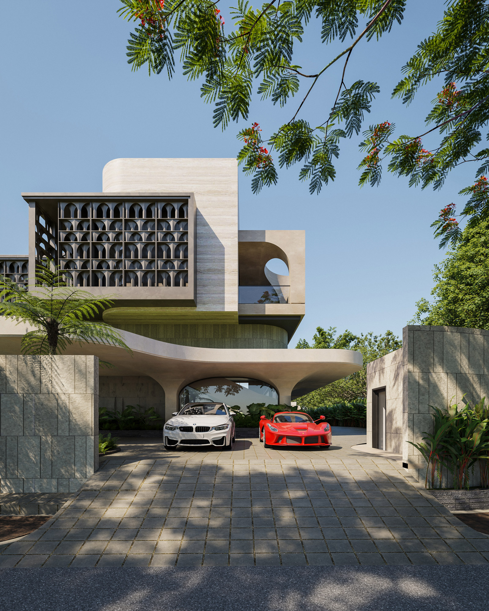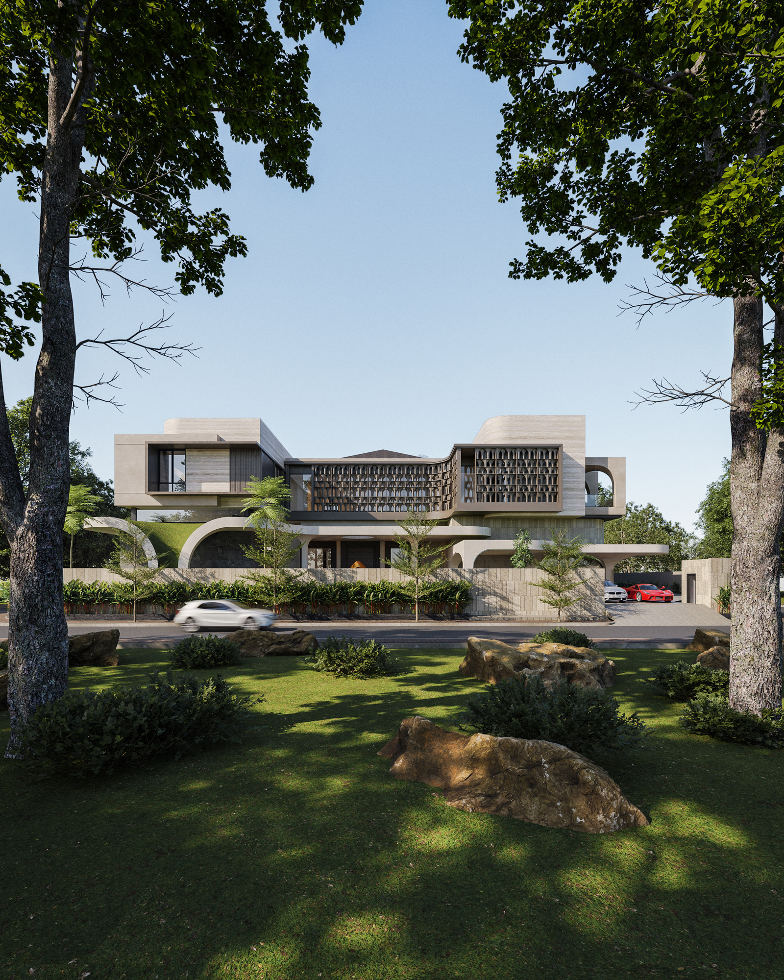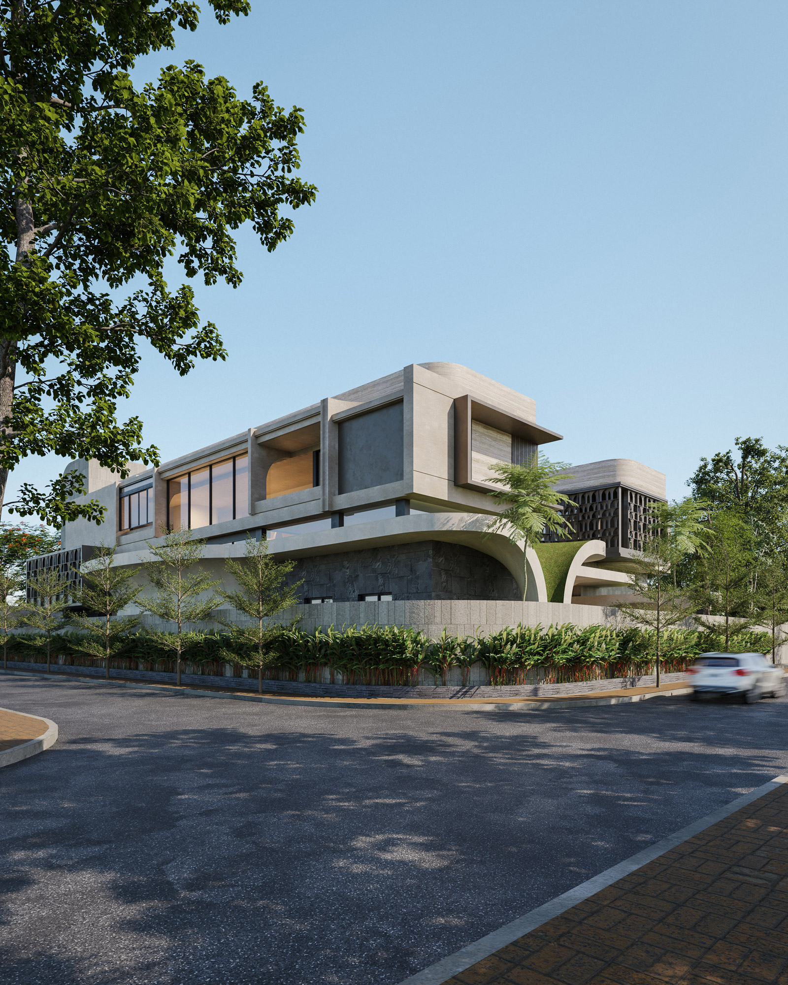 Set in the vibrant landscape of Surabaya, The Travertine Tides redefines modern luxury through fluid, organic architecture. The design challenges traditional residential block forms by introducing a sinuous, sweeping base that mimics natural topography. This continuous, curved podium functions as a living landscape, featuring integrated green roofs and deep overhangs designed for passive cooling in the tropical climate.