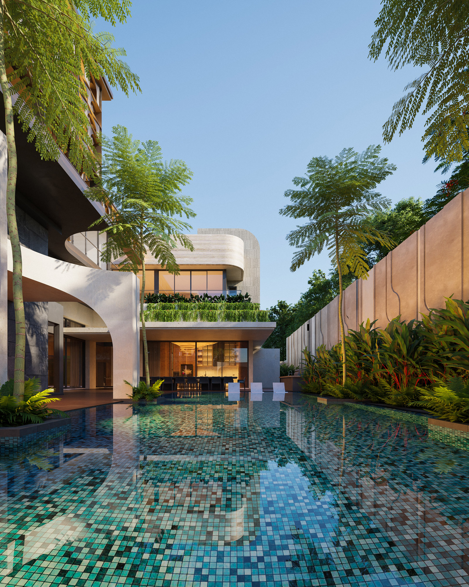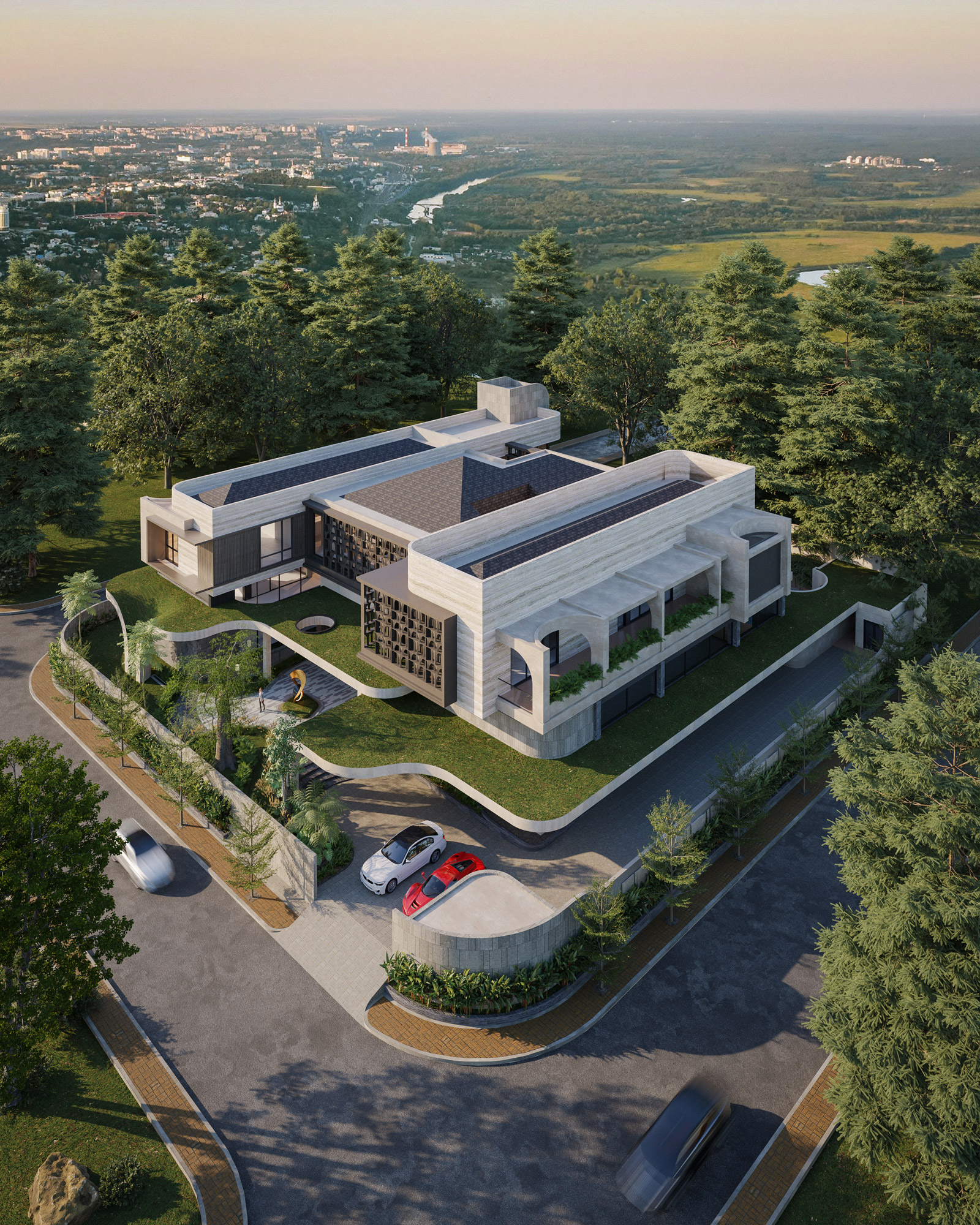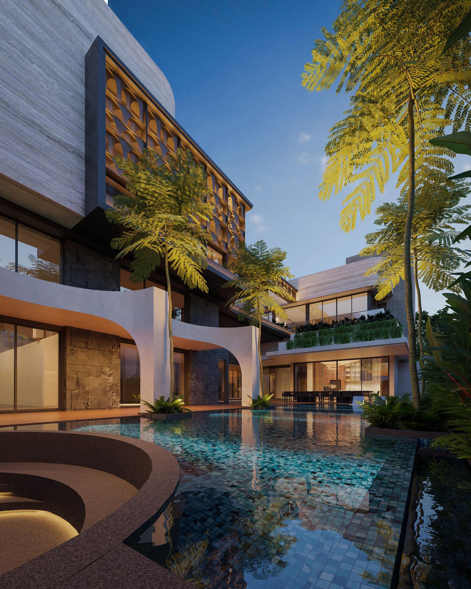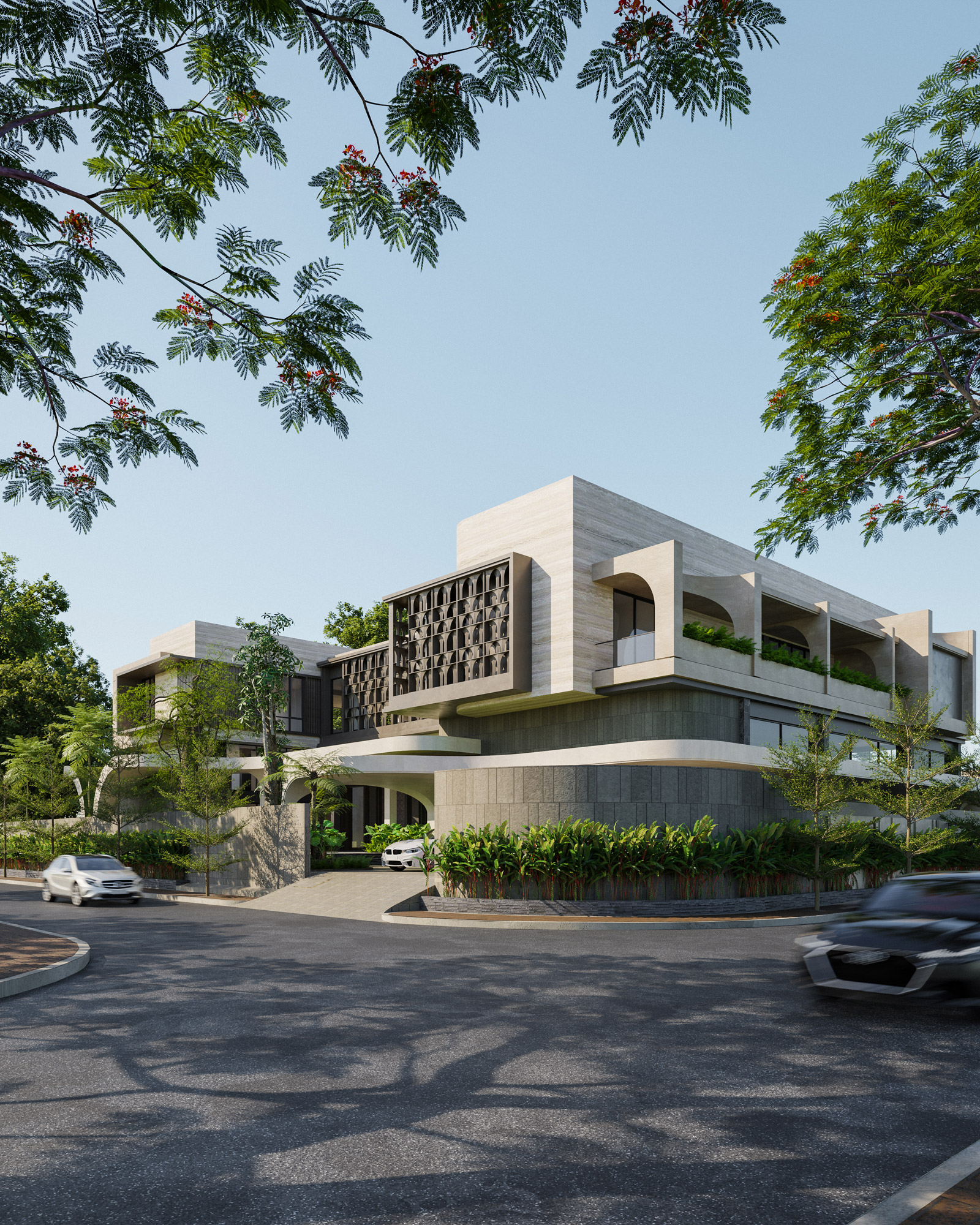 Rising above this flowing base are strong, interlocking upper volumes clad in elegant travertine. Expansive glass facades are shielded by custom dark metal lattice screens, beautifully balancing panoramic views with essential privacy and solar shading. By seamlessly blending heavy stone with organic lines and lush terraced gardens, The Travertine Tides establishes a unique urban sanctuary that effortlessly merges the built environment with nature.