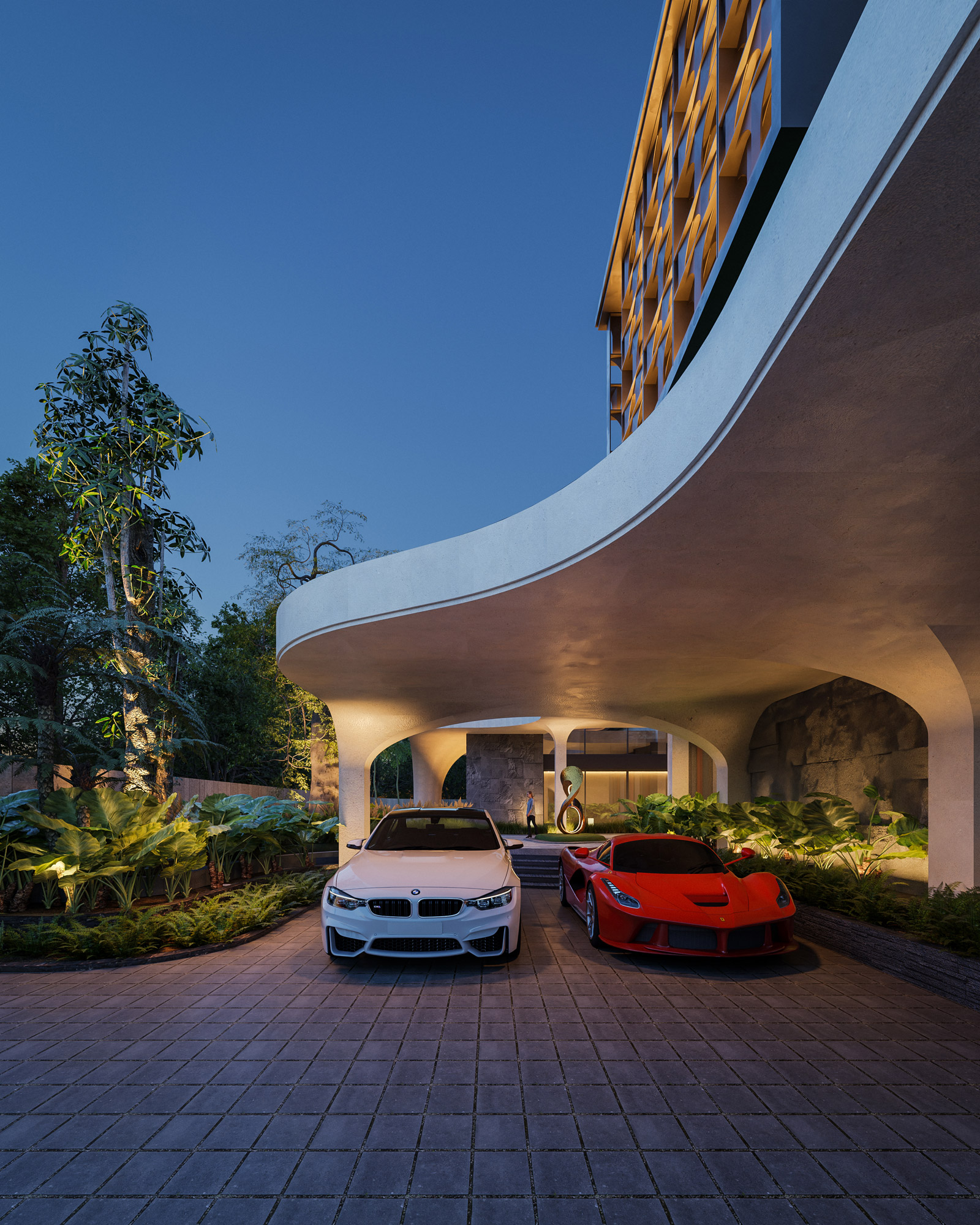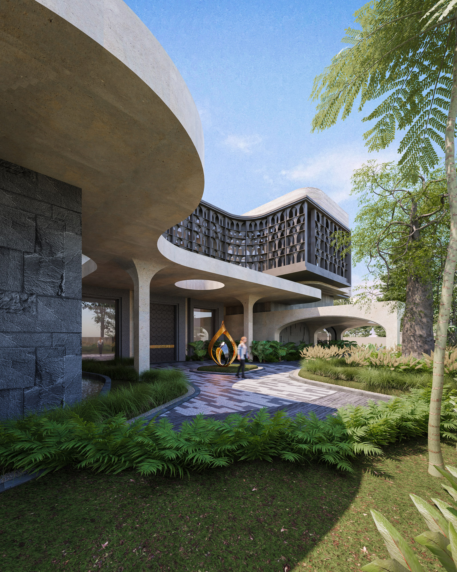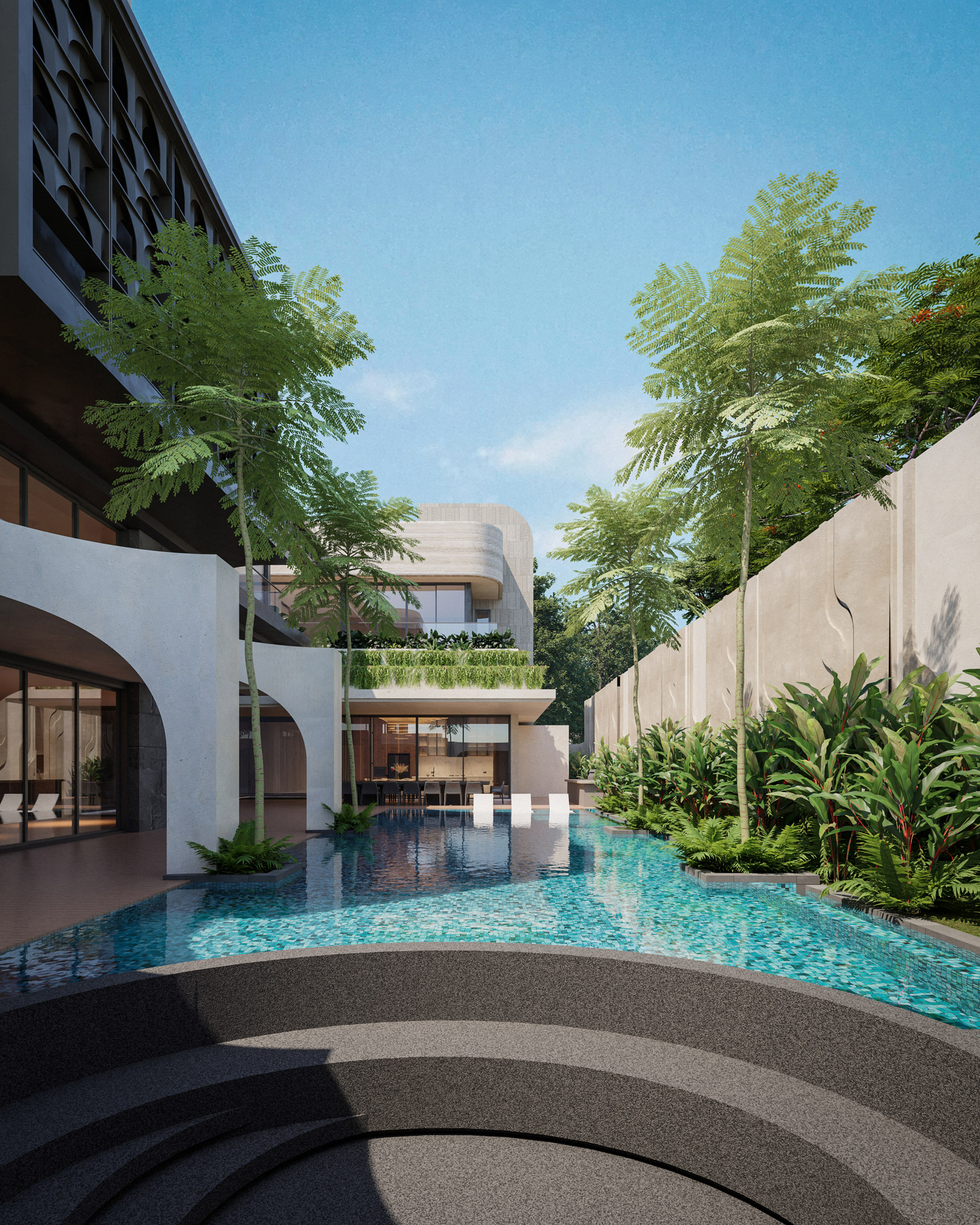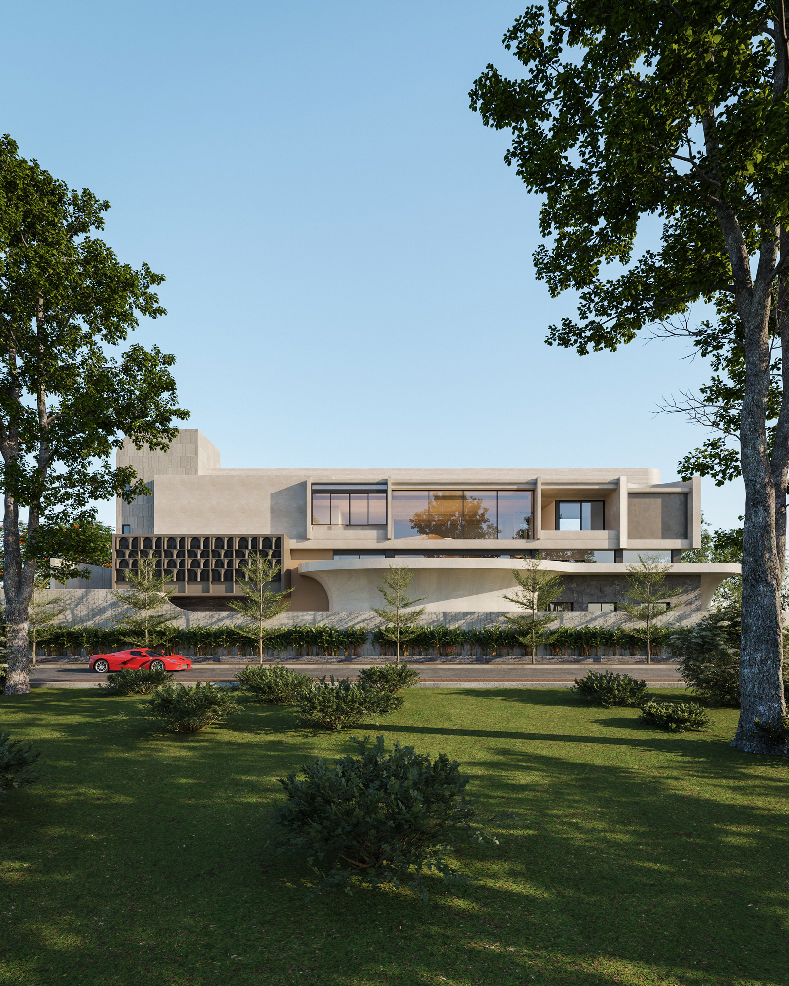 Rising above this flowing base are strong, interlocking upper volumes clad in elegant travertine. Expansive glass facades are shielded by custom dark metal lattice screens, beautifully balancing panoramic views with essential privacy and solar shading. By seamlessly blending heavy stone with organic lines and lush terraced gardens, The Travertine Tides establishes a unique urban sanctuary that effortlessly merges the built environment with nature.