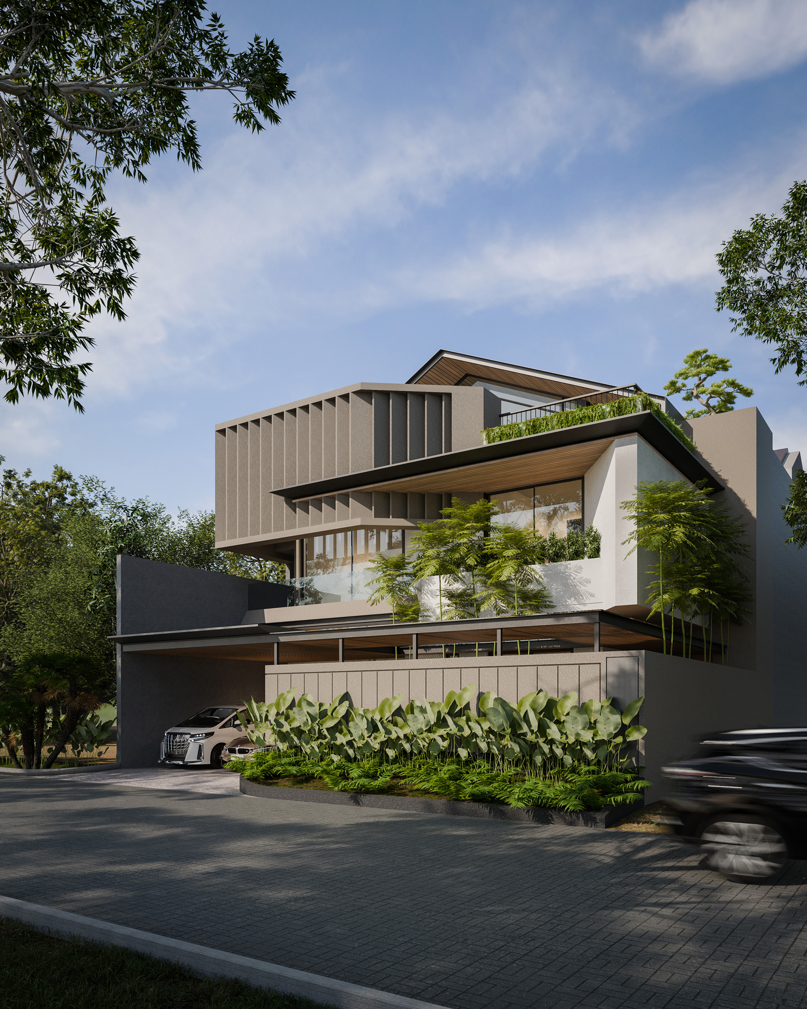 Designed to exist in harmonious dialogue with its natural surroundings. The exterior features a sophisticated interplay of raw, textured concrete, warm wood accents, and extensive vertical fins that provide privacy while sculpting the natural light. Nestled within a dense canopy of existing trees, the design seamlessly integrates greenery across multiple levels—from lush ground-level tropical planters to curated balcony gardens and expansive roof terraces—creating a continuous green thread that weaves through the entire structure.