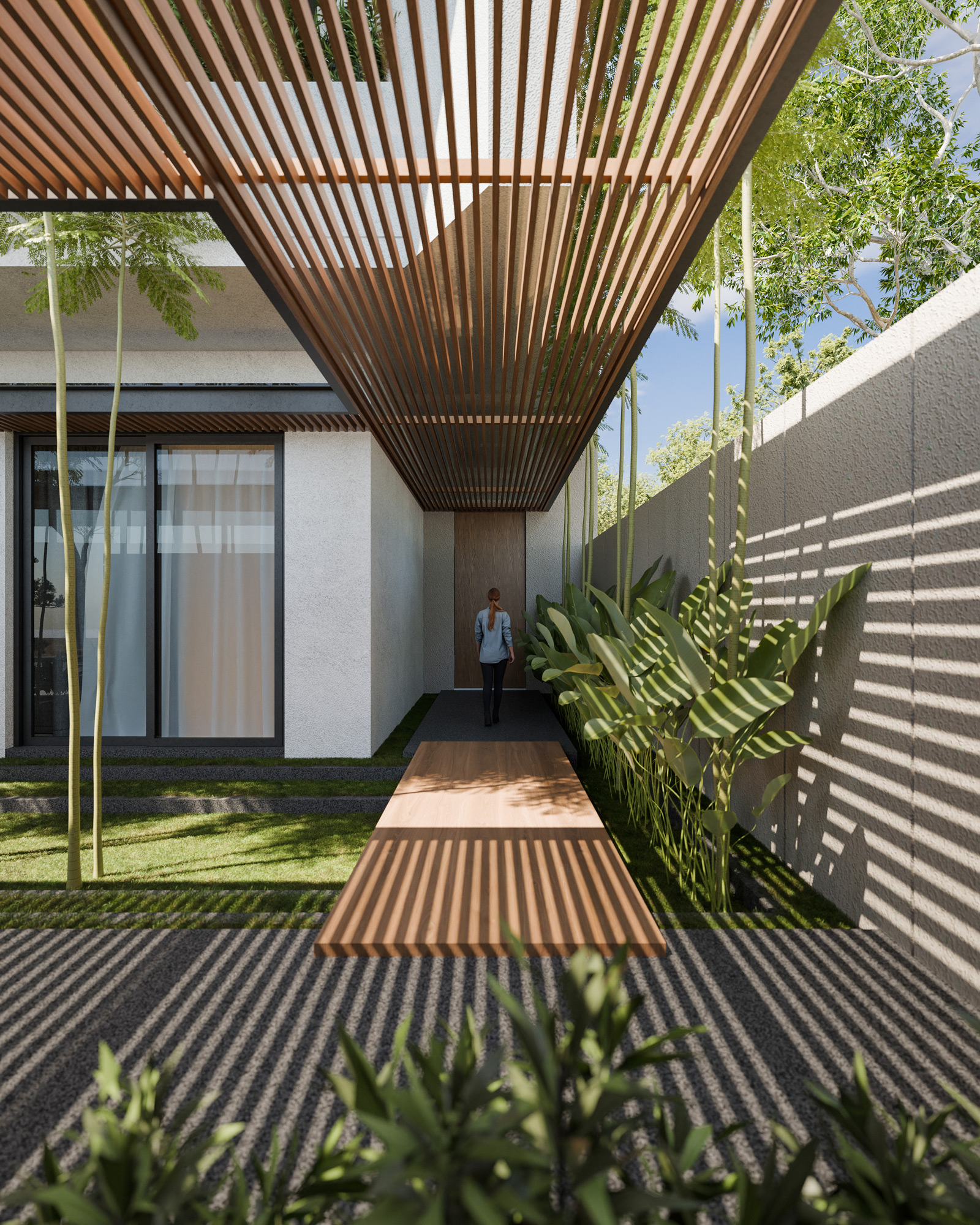 The approach to the house emphasizes a tranquil transition from the outer world, utilizing stepping stones and a stunning slatted timber ceiling that guides visitors into a contemplative entrance courtyard. Inside, expansive glass walls erode the boundary between indoors and outdoors, framing curated views of sculptural trees and bamboo screens. By combining bold geometric forms with sophisticated natural textures and multi-level green spaces, this home redefines luxury living as a balanced, immersive relationship with the environment.